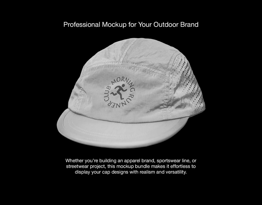 This mockup pack features 5 high-resolution PSDs of a lightweight running hat, captured in sharp detail — complete with smart object layers, mesh texture, and curved brim. Ideal for outdoor brands, sportswear designers, and product previews.